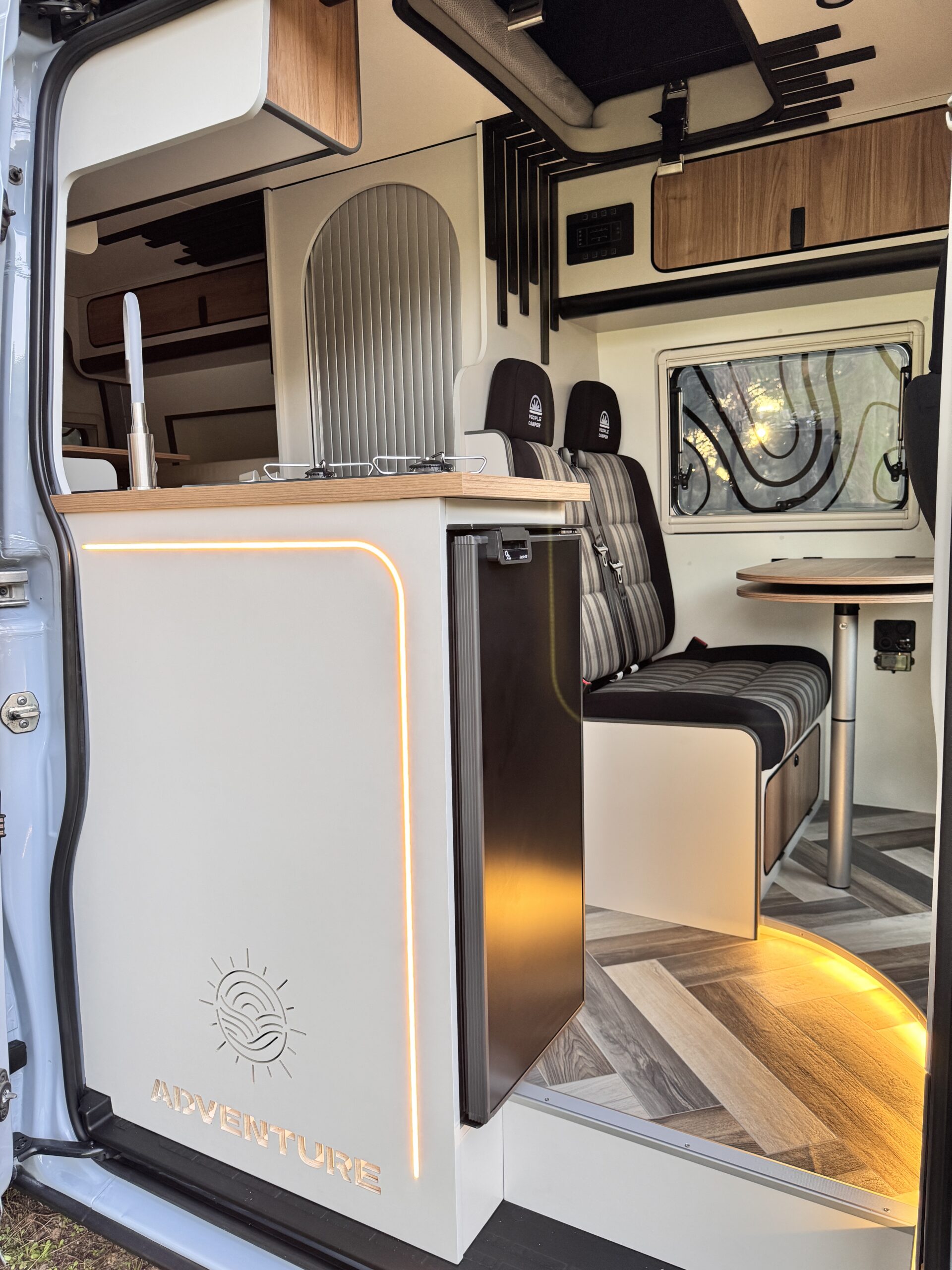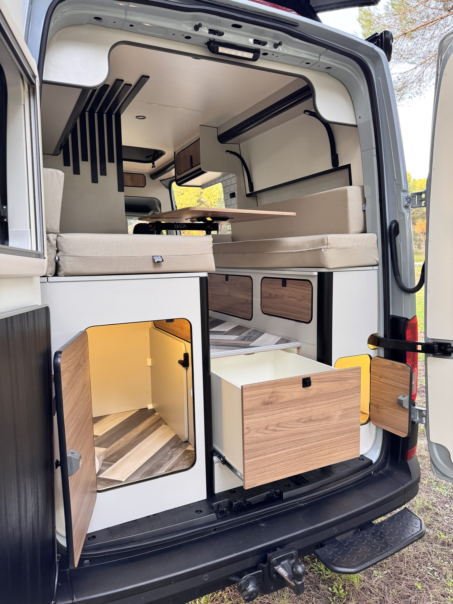 TIPO DE CAMPERIZACIÓN: Adventure, incluye instalación de electricidad (totalmente autónoma) con placa solar de 400w, instalación de ducha con agua caliente, cocina fija con fregadero y grifo de diseño, Cuarto de baño con WC Clesana seco con sistema de bolsas, claraboya con ventilador, asientos giratorios, Toldo Fiamma F45, Defensa delantera, Suspensión neumática Seikel elevada 5cm, Ventanas con mosquiteras y oscurecedores, Oscurecedores REMIS en cabina, Soporte de ruedas, capacidad para dormir y viajar hasta 4 personas, gran capacidad de almacenaje y diseños exclusivos de muebles