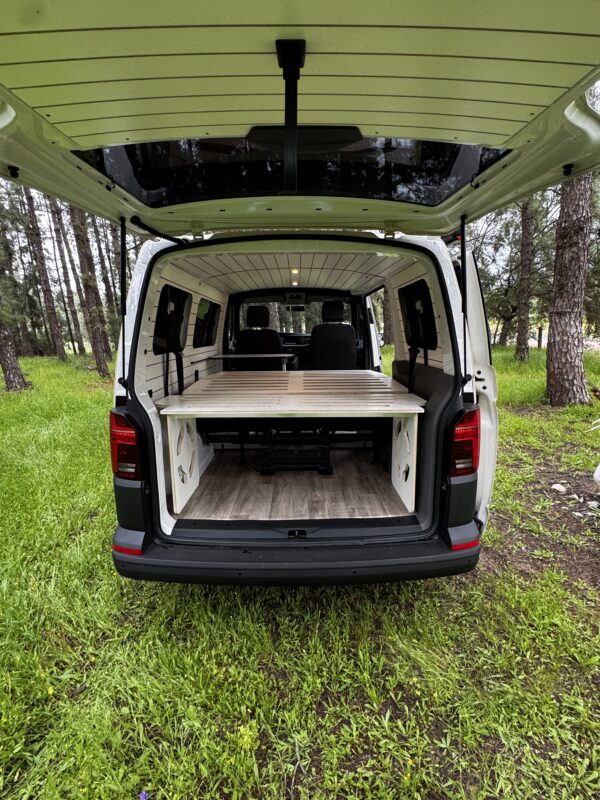 • TIPO DE CAMPERIZACIÓN: Basic, incluye la instalación de electricidad, Aislamiento completo, Paneleado interior, Estructura de mueble cama, Nevera empotrada en mueble, Mesa central corredera, Ducha portátil. Además, se le han incluido algunos extras como el Toldo F35, Terminación ALL-ROAD con snorkel BRAVO y llantas 18″ OZ con cubiertas Cooper Discoverer. Tiene capacidad para DORMIR hasta 3 personas, y VIAJAR hasta máximo 5 personas.