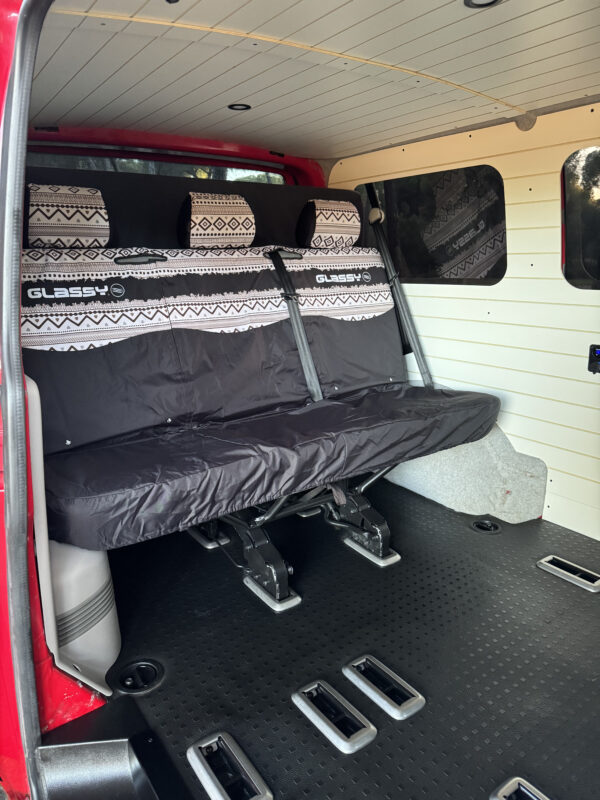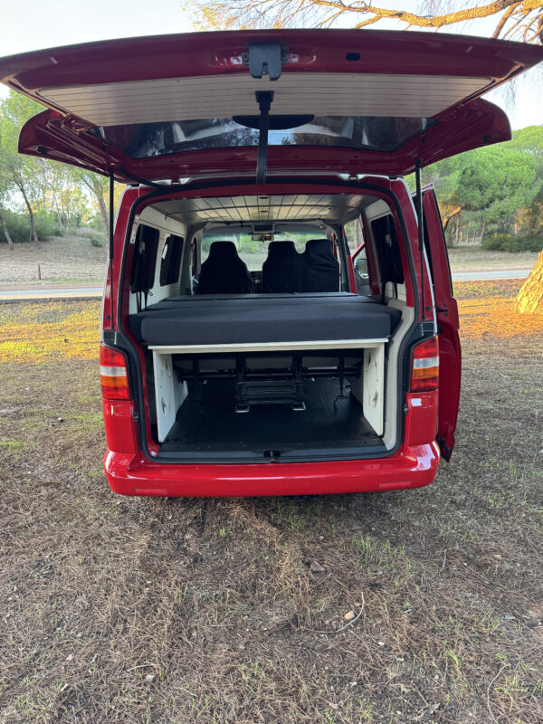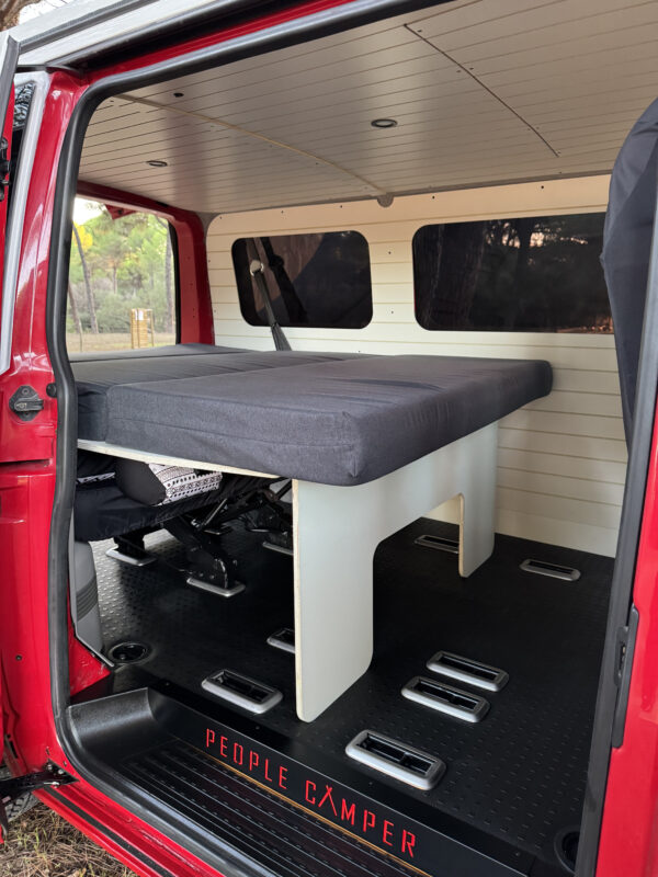 • TIPO DE CAMPERIZACIÓN: Posibilidad de camperizar a su gusto, incluye la estructura del mueble cama sin cajones y con colchón, TECHO ELEVABLE, Aislamiento Kaiflex 20 mm y Paneleado interior. En cuanto a electricidad incluye: Focos LED, Voltímetro, Tomas USB y 12V, Relé automático, Batería secundaria. Además dispone de una capacidad para viajar hasta 6 personas, todos los asientos llevan una funda impermeable antimanchas GLASSY.