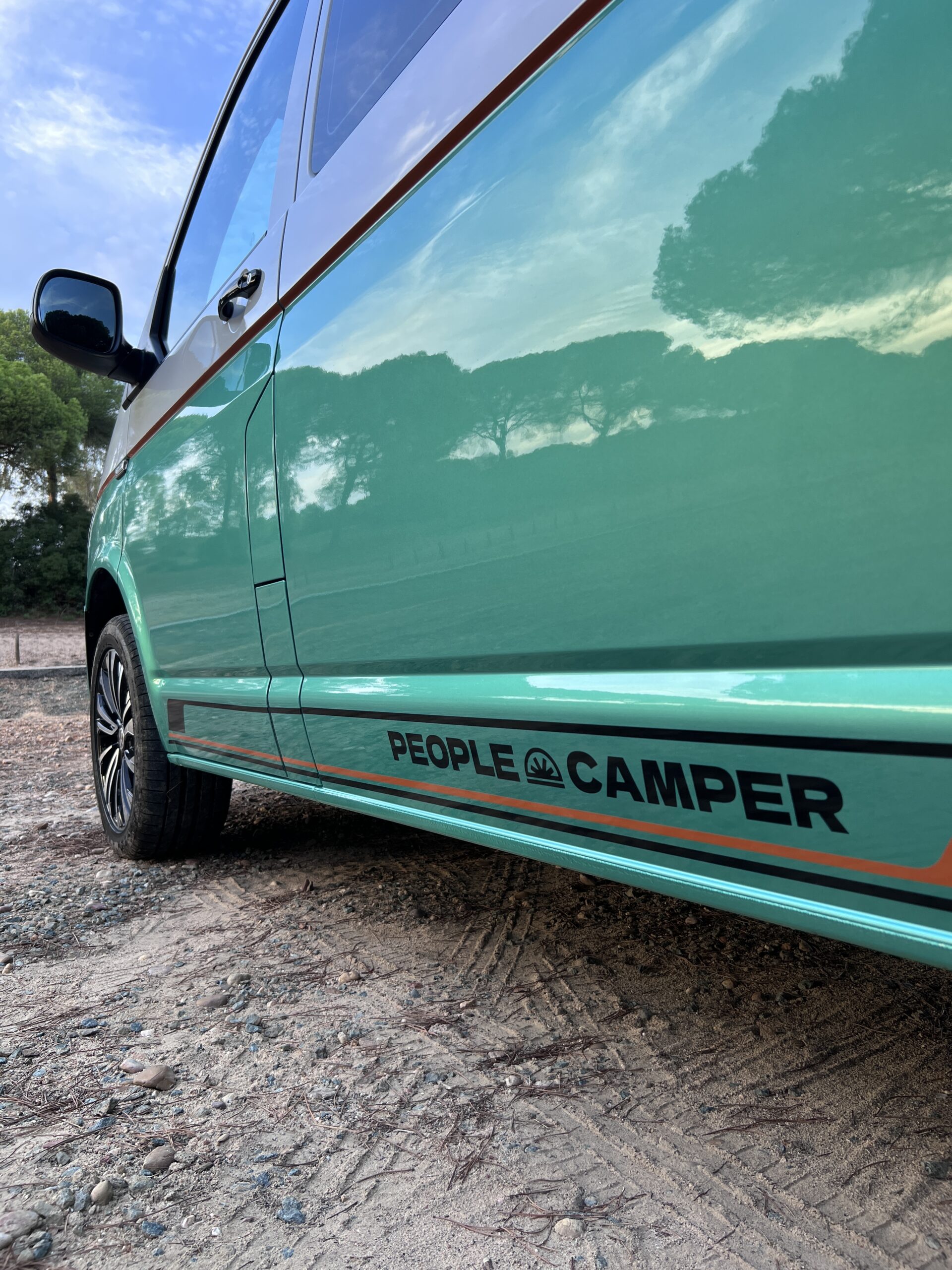 • DECORACIÓN EXCLUSIVA PEOPLE CAMPER: Vinilos decorativos, lunas tintadas y homologadas, Spoiler delanteros y pedales metálicos R-Line, LLANTAS 18”